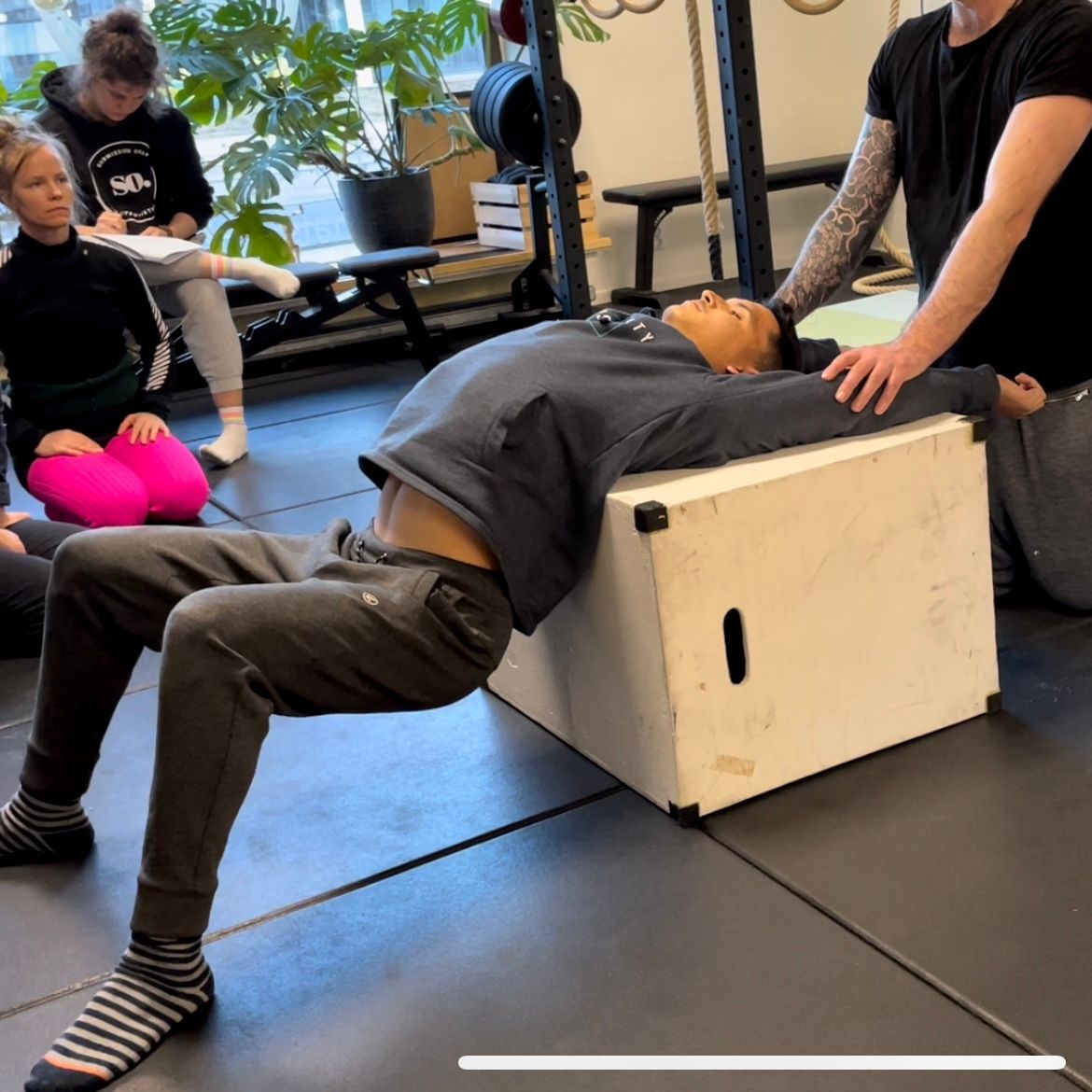 - Then with a controlled exhale, drop the hips down further and towards the support. Make sure to not only drive the hips down. They must move down and back towards the support to create the intention of moving into more of an arch.
