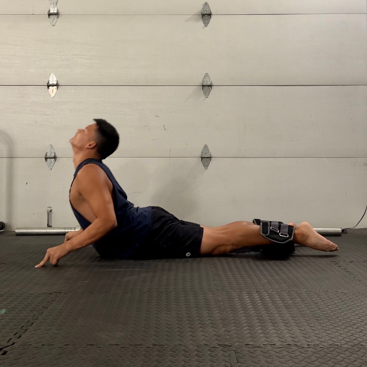 The first key setup detail is to place a weight behind the legs towards the feet. Placing a weight on the feet acts as an anchor to keep the legs pressed against the ground as we begin to extend the spine. You can see two different anchors in each of the pictures above and below. Feel free to get creative with what you use as an anchor. A few ideas are ankle weights, sandbags, plates on top of the feet, the bottom of a couch, or even a partner holding the feet down.