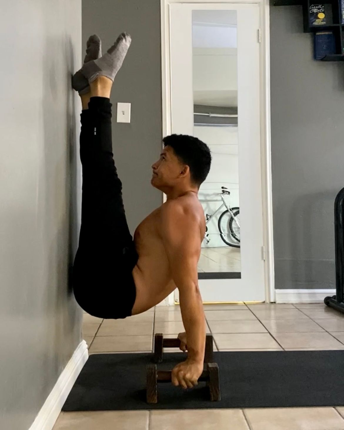 Once you're in the position, try to get your hips as high as possible by pushing strongly into the ground using your shoulders and triceps. From here, try to lift one leg off of the wall and closer to your body. Your body will naturally try to reduce the compression by leaning backward. Don't let this happen. Force the compression. To do this, you need to squeeze your quadriceps with your life. Don't sell yourself short here. Your quads are in charge of driving that compression. Hold your leg in the lifted position for the prescribed time and then repeat with the other leg.