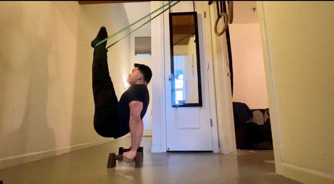 This is where the banded V-sit comes in. The banded V-sit was the first variation that really gave me a taste of how my body should feel in the full position. It was glorious and gave me a glimpse of hope that one day it'll be mine. I like to use this variation to teach two things. One, to teach the body how to position the hips nice and high, and two, to teach the triceps just how hard they need to contract in order to keep the hips in this high position.