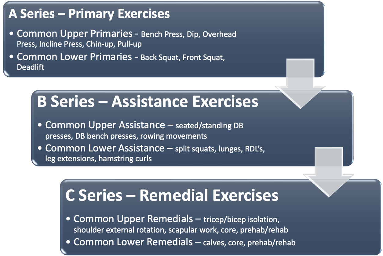 Primary Exercises - The building blocks of a program. The main exercises of the session that give the biggest return on investment. They are typically multi-joint compound exercises commonly performed for 6 reps or less.