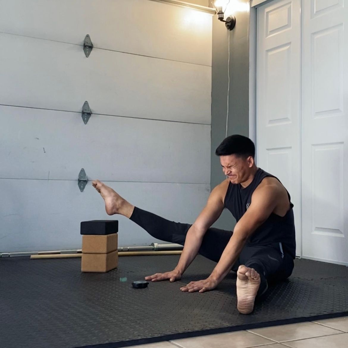 In the picture below i'm demonstrating a seated straddle compression lift similar to what I mention above except now i'm using tasking as a way to challenge my compression even more. By placing blocks under my feet, i'm forced to start at a height where my compression strength is much more challenged due to starting closer to my end range. You can see this from how little over the blocks my foot is.