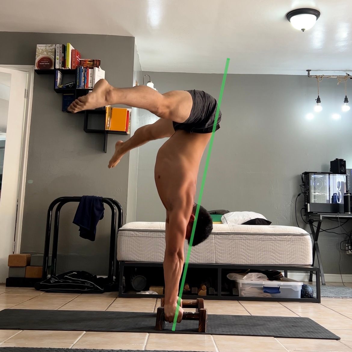 One thing to note about training towards this variation of straddle handstand is that we want to keep a straight line from wrist to hips. Similar to a straight handstand. However, since the legs coming into underbalance will shift the center of mass down and in front of the body, the body must lean in the opposite direction. This lean will bring the center of mass back over the base of support.
