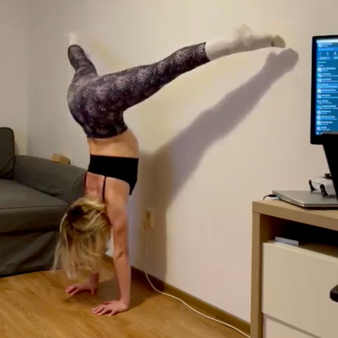 There exist many different wall straddle exercises. Below are three that I've had success with personally and frequently use with my students. The holds and liftoffs in the pictures below are demonstrated by online student, @loreonhands, who went through this very process to develop her freestanding straddle.